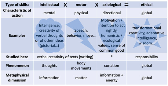 Also, in different types of ethics, for example virtue ethics (MacIntyre 2001) and organizational ethics (Lacroix et al. 2017), intellectual skills are considered as internal resources in the service of ethical skills (or “moral virtues”), such as responsibility. So, higher-order abilities such as intelligence and creativity might be required to act rightly in the Anthropocene, but they are not sufficient, they also must be (i) oriented towards a common good and (ii) translated into physical actions (Figure 1; Sternberg 2018). So, ethical skills such as wisdom (Sternberg 2018), “successful” (Sternberg 2018), or “adaptative” intelligence (Sternberg 2019) and responsibility (Hagège 2019) may achieve this coordination of intellectual skills with ethical physical actions: they involve multiple types of skills; so, they are more complex than creativity, which can be solely intellectual or motor, depending on the domain (Figure 1), and they necessarily involve the “practical intelligence” or “common sense” that applies such higher-order cognitive abilities to “real-world contexts” (Sternberg 2018, p. 4; Lacroix et al. 2017).
