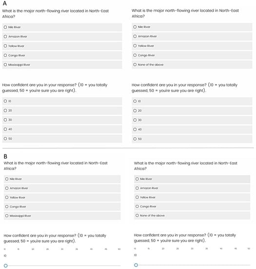 Examples of questions and confidence rating prompts in Experiments 1a and 1b. Panel (A) shows how an example question and confidence scale appeared on the screen in Experiment 1a when that item was in the basic condition (left) and NOTA condition (right). Panel (B) shows how an example question and confidence scale appeared on the screen in Experiment 1b when that item was in the basic condition (left) and NOTA condition (right).