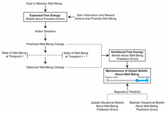 An allostatic active interference model of well-being. To achieve the goal of high well-being, individuals select actions that promote positive well-being changes and information gain, known as minimizing expected free energy. During this action selection, an internal model estimates the likelihood of well-being change outcomes, allowing the individual to make predictions. After performing the action, individuals observe how the actions impacted their well-being and must update their predictive model to minimize the degree to which the model predicts the wrong outcome in the future. This prediction error along with a valuation of parsimony is known as the variational free energy (VFE). Individuals with high resilience ability maintain stably positive global beliefs about well-being in the face of threats and flexibly regulate when to update and when to maintain situational beliefs about well-being.