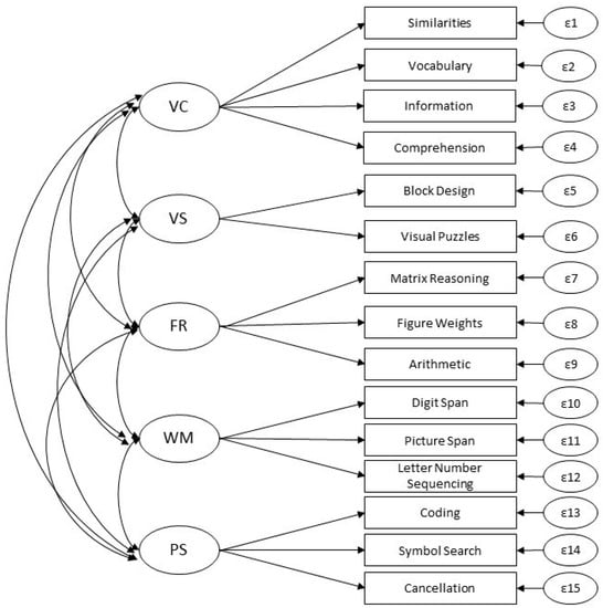 WISC-V European Scoring Factor Structure used as the Baseline Model. (Note. This first-order five-factor model was the best-fitting model in all samples independently and was the basis for testing of measurement invariance. ε = unique variances of the indicators. VC = Verbal Comprehension (Gc), VS = Visual Spatial (Gv), FR = Fluid Reasoning (Gf), WM = Working Memory (Gwm), PS = Processing Speed (Gs)).