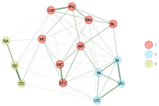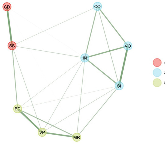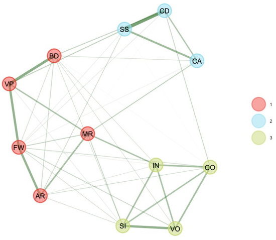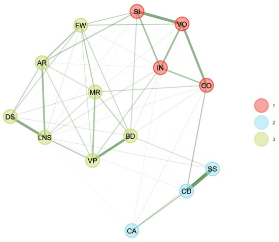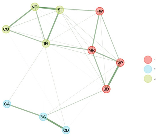 EGA with the GLASSO estimation and Walktrap community detection algorithm estimated three clusters of nodes, three dimensions (see