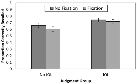 Recall performance as a function of judgment and fixation group in Experiment 1. JOL = judgment of learning. Error bars reflect the standard error of each mean.