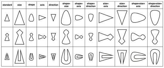 We used three two-dimensional figures as the standard shapes (see first column in Figure 1). They were characterized by a comparable spatial structure: they were all angular rather than rounded; the main (i.e., the longest) axis was vertical; and they were oriented upwards. For each figure, there were twelve comparison figures, eleven of which were obtained by transforming either one, two or three of the features of the standard figure. From a phenomenal point of view, the transformations consisted of a change in the shape of the contour (i.e., from angular to rounded), the size of the figure (i.e., from small to large), the axis of orientation (i.e., from vertical to horizontal) and the direction of orientation (i.e., from pointing upwards to pointing downwards)4. These four basic transformations were applied either singly or combined with other transformations. The transformations regarding the axis or the direction were the only two that were never applied together since this is not possible, but they were presented in association with all of the other transformations. An example of each transformation is shown in Figure 1.