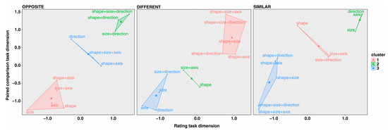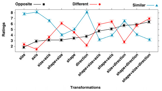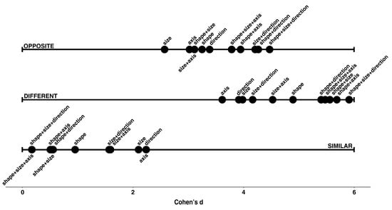 As shown in Table 2, all of the transformations had a significant effect (either medium or large) on S in the sense that they reduced the degree of similarity attributed to the identity pair to varying extents (hence the negative values for Cohen’s d in the 6th col.). Likewise, all of the transformations had a significant, but in this case positive, effect on the D ratings (either medium or large); namely, they increased the D rating given to the identity pair to varying extents. Three of the transformations had no significant effect on the O ratings. That is to say, the single transformation relating to the axis of orientation (from vertical to horizontal), the same transformation combined with a change in size (from small to large), and the transformation in size in combination with that of the contour (from angular to rounded) did not lead to greater or smaller ratings of opposition with respect to the identity pair. In all other cases, a significant effect emerged. The effect size was in general smaller than that for the S and D ratings (almost all cells in Table 2 are marked with (3)). Only the combined transformation in direction and size (size+direction) had a medium (rather than small) effect on the O ratings. Interestingly, the same transformation only had a small effect on the D ratings. As can be seen in Figure 2, the three transformations that received an O rating which was significantly higher than the D rating are those involving a single transformation of the axis of orientation or of the direction of orientation. In the latter case, this referred to both single transformations or those in combination with an enlargement in size (size+direction), but always without any transformation in the contour (i.e., from angular to rounded, shape+). When a transformation of the contour was involved, this tended to receive a higher D than O rating (see, in Figure 2, the shape+size, shape, shape+size+axis, shape+axis, shape+size+direction transformations). Only when a change in contour was associated with a change in direction (shape+direction) was the extent to which they were perceived to be D and O similar.