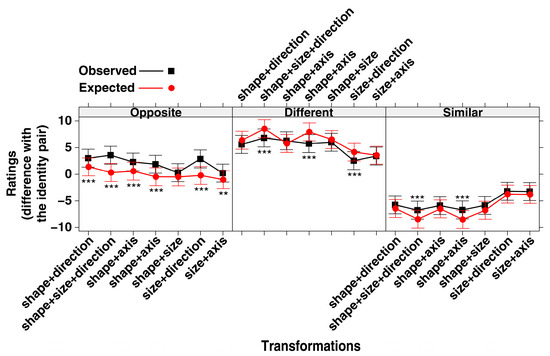 Effect plot of the interaction between Type of Relationship, Transformation and Expected/Observed Rating. Error Bars represent the 95% confidence interval. The asterisks indicate the stimuli for which a significant difference emerged. ** p < .01; *** p < .001.