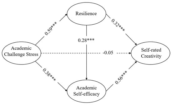 APA StyleYao, H., Chen, S., & Liu, A. (2023). Exploring the Relationship between Academic Challenge Stress and Self-Rated Creativity of Graduate Students: Mediating Effects and Heterogeneity Analysis of Academic Self-Efficacy and Resilience. Journal of Intelligence, 11(9), 176. https://doi.org/10.3390/jintelligence11090176