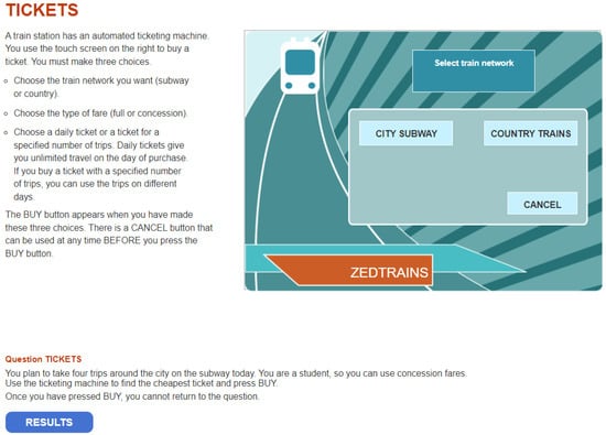 The 2012 PISA public dataset consists of 48 problem-solving items divided into 16 units, designed to assess participants’ cognitive skills in addressing real-world challenges through computer-based simulated scenarios (). This study primarily focuses on the TICKETS task2 (CP038Q01) problem-solving item. More detailed information on this item can be found at the following site: https://www.oecd.org/pisa/test-2012/testquestions/question5/ (accessed on 1 September 2023). Figure 1 displays the screenshot of the opening page of this task, while Figure A1 provides screenshots of the pages illustrating the stages in solving the problem, as described by  (). As depicted in Figure 1, this item provides students with a simulated problem-solving scenario involving ticket purchase. It requires them to determine the cheapest ticket option from the ticketing machine for a four-trip journey on the city subway. Furthermore, students have the option to purchase a concession fare as well. Therefore, this interactive question requires students to actively explore and collect the required information to make an informed decision (). Therefore, the primary cognitive processes involved in this task are planning and execution (; ; ; ; ).