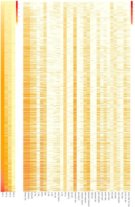 Figure 2 displays the heatmap illustrating the values of features in the log files, arranged in ascending order of the total time spent on this task (T_time). Noticeable individual differences in the time features (T_time, A_time, S_time) can be observed. In terms of action-based features, subsequences such as city_concession and city_subway occurred with higher frequency compared to others. Certain features, such as S_city, were consistently used, while others, like country_full and trip_1, were utilized more rarely. Some features, like Cancel, exhibited variations among students similar to the trend of T_time. Moreover, the relationship between pairs of sequence features differed across subgroups of students. Specifically, only a subset of students simultaneously exhibited large T_time and E_time, similarly for city_concession and Cancel. This suggests that a biclustering approach may hold promise to identify features that move in unison among subgroups of students.