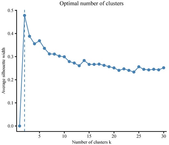 For the k-means method, we considered a maximum of 30 clusters to be found. We employed two different criteria to determine the optimal number of clusters. The first criterion was the average silhouette width, which is a commonly used measure. We employed the NbClust method to determine the optimal number of clusters for the data set using the “fviz_nbclust” function in the R package factoextra (). We calculated the average silhouette width for cluster numbers ranging from 1 to 30 and depicted the relationship in Figure 5. Notably, the two-cluster solution exhibited the highest silhouette width, indicating that two clusters would be the optimal choice. The second criterion utilized was the evaluation of VAR, MSR, and VE. Table A3 presents the mean values of VAR for different cluster numbers, which aligned with the results depicted in Figure 5, suggesting that the optimal number of clusters was also two according to VAR. However, when considering the criteria MSR and VE, different solutions emerged. MSR identified a total of 20 clusters as the optimal configuration, while VE suggested a higher number of clusters, specifically 29.