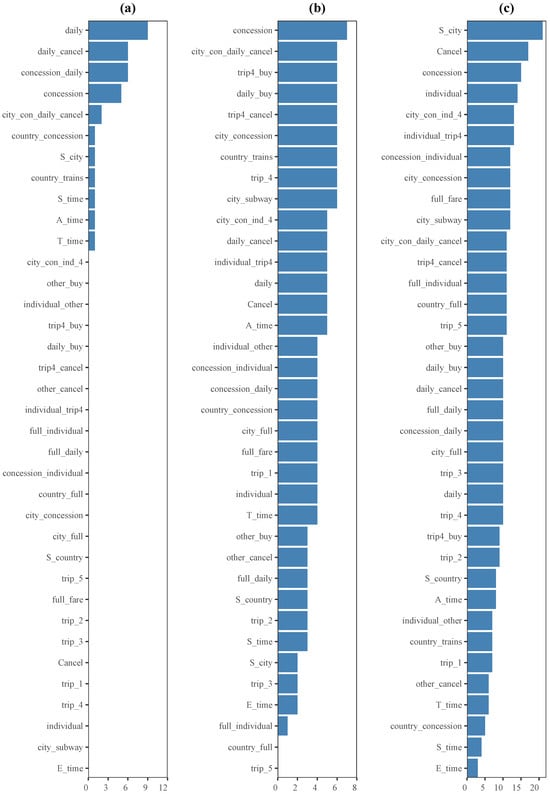 Furthermore, to provide a more precise interpretation of the clustering results, it is important to establish the connections between the features and the solutions. Identifying key and efficient sequences of actions is essential for addressing the problem at hand. Therefore, in this context, the most effective approach involves comparing the following two action sequences: Start–city–subway–concession–individual–trip4 and Start–city–subway–concession–daily. It is worth noting that the Cancel action plays a crucial role. Therefore, features including city_subway, concession, individual, trip_4, cancel, daily, S_city, city_concession, concession_daily, concession_individual, individual_trip4, daily_cancel, trip4_cancel, trip4_buy, city_con_ind_4, city_con_daily_cancel are expected to appear frequently as high-frequency features.