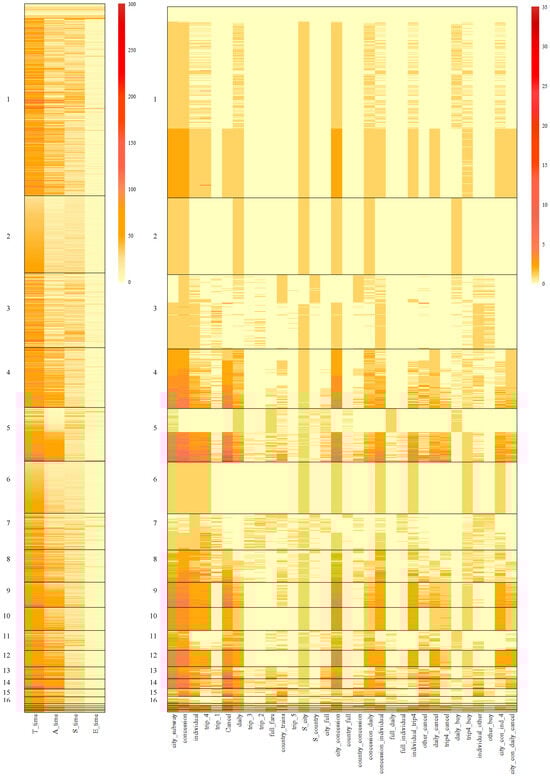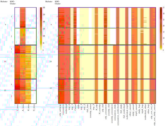 When a feature was included in a bicluster, the average within-cluster magnitude on the feature could either be high or low. For example, in Clusters 9 and 10, features city_subway and concession exhibited homogeneity with high average values, while features trip_1 and country_full exhibited homogeneity with low values, suggesting that individuals within these biclusters seldom performed these two subsequences.