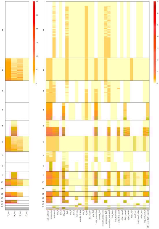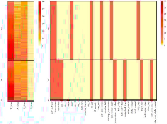 Furthermore, it is worth highlighting that the time-related features, including T_time, A_time, S_time, and E_time, were consistently selected as important features for achieving coherence among the biclusters in Figure 6. This suggests that there exists a similarity in terms of time-based patterns within certain coherent clusters. The significance of time-related features in classification is to be expected, since time intuitively plays a crucial role in problem-solving and learning dynamics. This finding is also consistent with the observations in  (), where the presence of rapid learners in complex problem-solving scenarios was identified. Therefore, the inclusion of time-related features further enhances the understanding of students’ behaviors and performance in the context of the analysis.