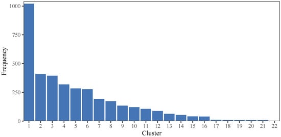 Figure 9 presents the number of examinees in each cluster under the BCCC method. Firstly, we ranked the clusters based on the number of examinees in each cluster in decreasing order. As depicted in Figure 9, Cluster 1 contains the highest number of examinees, with a total of 1021 individuals, whereas Cluster 22 consists of only 2 examinees, which is the lowest among all clusters.