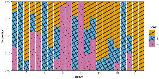 Based on the selected optimal biclustering solution, the distribution of scores was analyzed within each bicluster. Further, through the level of scores, biclusters were classified into four different types, including clusters that corresponded to scores of 0, 1, 2, or a mix of different scores.