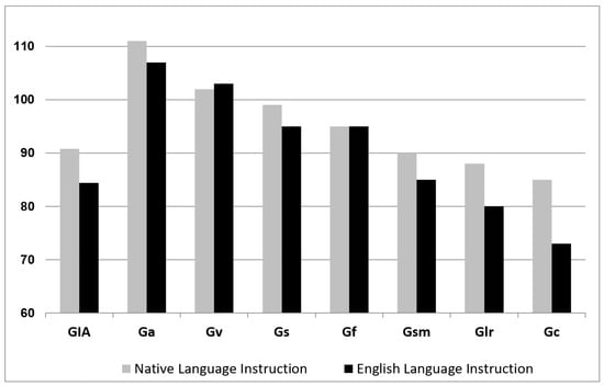 An excellent example of the impact that multilingualism has even on tests developed in other languages, such as Spanish, can be seen in cases where the norms are based on monolingual speakers of that language. Consider that when such tests are created for use in the U.S., the use of monolingual Spanish speakers to construct the norms ignores the fact that individuals in the U.S., particularly students, are invariably exposed to English and are required to learn it. They are, therefore, always set forth on a path toward some level of bilingualism and have left their monolingual Spanish speaker status behind. This line of inquiry remains grossly under-researched, but what little is available highlights the similar manner in which acquisition of language and acculturative knowledge affects test performance for multilinguals in the U.S. Figure 2 depicts results from one such study (Esparza-Brown 2007) on bilingual, Spanish-speaking children in the U.S. whose intelligence was tested with the Batería-III (Muñoz-Sandoval et al. 2005) and where a unique and enlightening grouping variable not found in other investigations was utilized—instructional programming in the native language vs. instructional programming in English only.