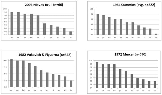 What Valdés and Figueroa (1994) alluded to in terms of “unusual subtest profiles” is made much clearer if one arranges the mean values in order of magnitude. Figure 3 shows this pattern based on four typical studies that include Mercer (1972), Vukovich and Figueroa (1982), Cummins (1984), and Nieves-Brull (2006).