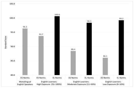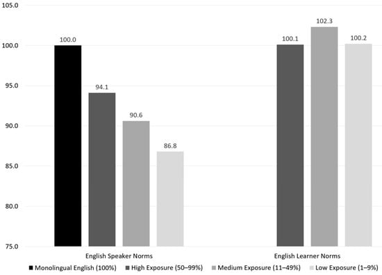 That the use of exposure norms succeeds in this regard can be seen in various analyses conducted with the Ortiz PVAT. The Technical Manual (Ortiz 2018) provides an initial analysis which examines the performance of individuals who are aggregated into four categories: (1) those who are 100% monolingual English speakers and have only been exposed to English in their lives; (2) those who have had a high amount of exposure to English encompassing 50–99% of their lives; (3) those who have had a medium amount of exposure to English ranging from 11–50% of their lives; and (4) those who have had a low amount of exposure to English of less than 10% of their lives. The performance of the individuals in each group was then scored according to English speaker norms, and the three non-monolingual groups were also scored using English learner norms. Results from this analysis are presented in Figure 4.