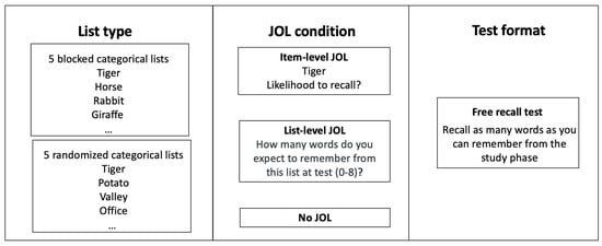With this background, the current experiment had two aims. The first was to reconcile the mixed findings of JOL reactivity with categorized lists, and the second was to conduct further tests of Senkova and Otani’s (2021) item-specific processing hypothesis. To achieve the aims, we factorially manipulated the organization of categorized lists (randomized vs. blocked) and JOL condition (item-JOL, list-JOL, and no-JOL), with both variables being manipulated between participants.