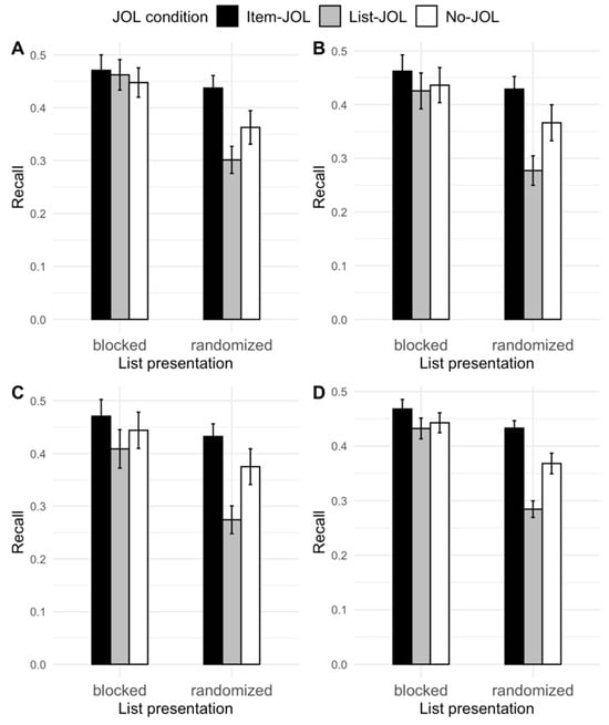 We first conducted 2 (list organization: blocked, randomized) × 3 (JOL condition: item-JOL, list-JOL, no-JOL) × 3 (Test: 1, 2, 3) mixed ANOVA for recall. The ANOVA revealed a main effect of list organization, F(1, 231) = 12.71, MSE = 0.10, ηp2 = 0.05, p < .001, a main effect of JOL condition, F(2, 231) = 4.86, MSE = 0.10, ηp2 = 0.03, p = .009, and a main effect of test, F(2, 462) = 6.19, MSE = 0.002, ηp2 = 0.03, p = .002. Least significant difference (LSD) tests showed that the main effects were due to the fact that recall was higher for blocked lists (M = 0.45, SD = 0.20) than for randomized lists (M = 0.37, SD = 0.18), t(231) = 3.56, d = 0.41, p < .001, higher in the item-JOL condition (M = 0.45, SD = 0.17) than in the list-JOL condition (M = 0.37, SD = 0.21), t(231) = 3.12, d = 0.44, p = .002, and higher on the first recall test (M = 0.42, SD = 0.18) than on the second (M = 0.40, SD = 0.20), and the third recall test (M = 0.40, SD = 0.21), t(231) = 3.13 and 2.45, ds = 0.20 and 0.16, ps < .015. Additionally, there was a JOL condition × Test interaction, F(4, 468) = 2.99, MSE = 0.004, ηp2 = 0.03, p = .019. The JOL condition effect was significant across all three recall tests, ps < .032, but it increased slightly from test 1 to test 2 to test 3. Last, the interaction that is of primary interest, the JOL condition × List organization interaction, was not significant, F(2, 231) = 1.87, MSE = 0.10, ηp2 = 0.02, p = .156.