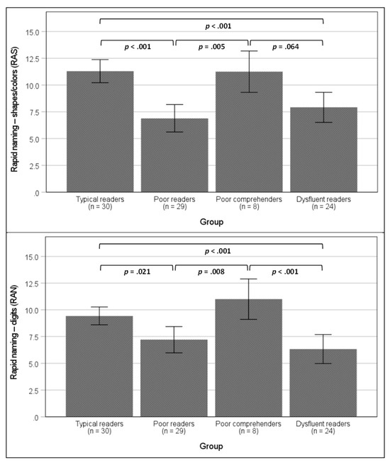 Mean differences among groups in the RAN and RAS tasks. Note: error bars represent 95% interval confidence. p-Values are for the Bonferroni post-hoc comparisons. Effect sizes: η2p = 0.294 for RAS; η2p = 0.236 for RAN.