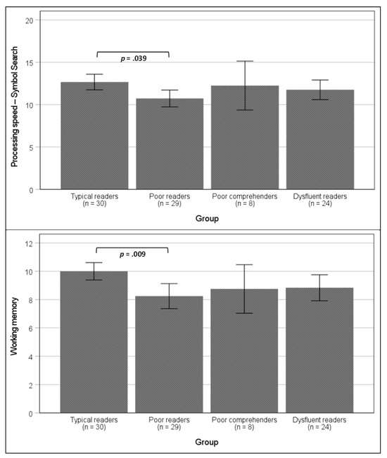 Mean differences among groups in the processing speed (symbol search) and working memory tasks. Note: error bars represent 95% interval confidence. p-Values are for the Bonferroni post-hoc comparisons. Effect sizes: η2p = 0.085 for processing speed; η2p = 0.115 for working memory.