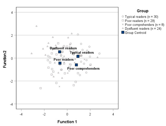 Figure 4 depicts how groups are spaced along the functions according to their centroids. The inspection of this plot suggests that the first function (the significant one) separates the groups with fluency difficulties (poor readers and dysfluent readers) from the groups without fluency difficulties (typical readers and poor comprehenders). The second function discriminates between those without comprehension difficulties (dysfluent readers and typical readers) and those with (poor comprehenders and poor readers).