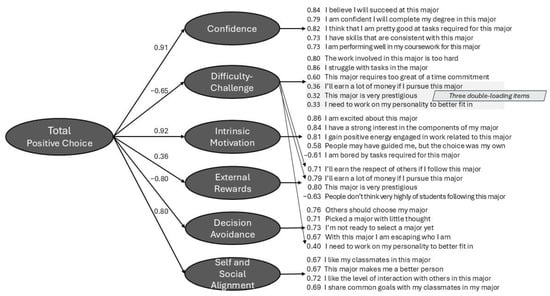 A confirmatory simple-type structure factor model of the Choice of Major Scale. The solution yielded one overall “Positive Choice” factor and six more specific factors from Confidence to Self and Social Alignment. Items in the diagram are sometimes abbreviated. Each item loads on one factor with the exception of three items from Difficulty-Challenge, of which two had primary loadings on External Rewards and one on Decision Avoidance.