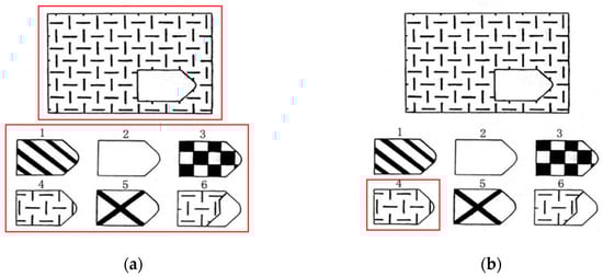 Areas of interest (AOIs) set in Raven’s Progressive Matrices (using the first item as an example). The left image (a) shows “answers” and “correct”, while the right image (b) shows “correct”.