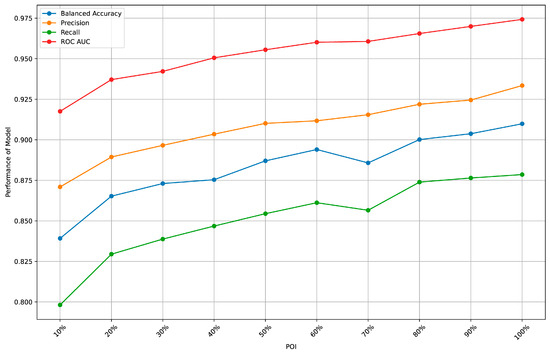 To determine whether the size of the POI affects the accuracy of ML models based on eye-tracking metrics, we conducted repeated analyses using ten POIs (i.e., 10% to 100%). The analyses were performed using XGBoost, identified as the best-performing ML model in this study. To ensure the objectivity of model performance and avoid overfitting, we employed ten-fold cross-validation. The results are visualized and presented in Figure 2.