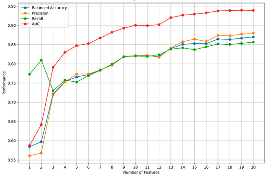 Using eye-tracking information at the 60% POI, we added features to the model in descending order of importance based on their significance. The relationship between the number of features and model performance is shown in Figure 4. The results indicate that with only nine eye-tracking metrics, the model’s performance metrics can all exceed 80%. When the number of features reaches 13, further increasing the number of features results in a slow improvement in the model performance. This suggests that with 13 features, the model has nearly reached its performance limit given the current data and feature set. Therefore, we believe that in our study, using only nine eye-tracking metrics can achieve good predictive results. When the number of metrics increases to 13, further 3increasing the metrics will raise the computational cost of the model, but the improvement in model performance is very limited.