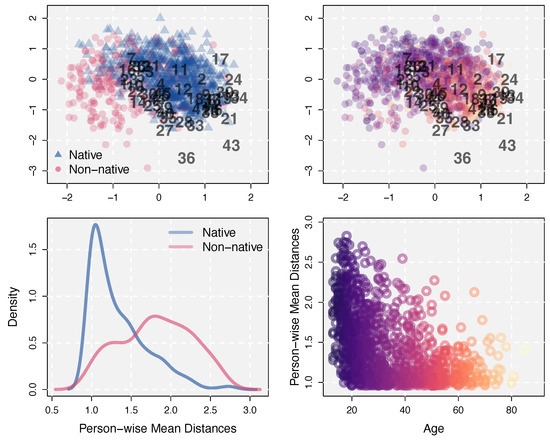 Top: The estimated latent space for the VIQT data. Persons are color-coded according to whether their first language is English or not (left) or according to their age (right). Bottom: Person-wise mean distances to items (averaged across items). Densities for English native speakers and non-natives (left) and a scatter plot of distances as a function of age (right). For age, yellower-brighter represents older whereas purpler-darker represents younger.