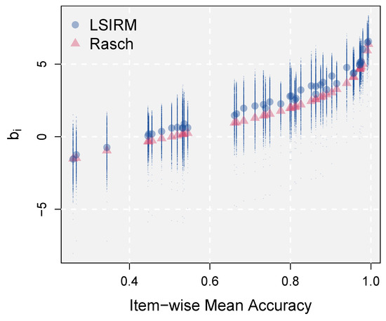 In Figure 2, the Rasch estimates of item difficulty (red triangles) are plotted on the y-axis against observed item-wise mean accuracy values on the x-axis. The item effects estimated by the LSIRM are plotted in two ways. First, the distance effects were averaged over respondents, but by item separately, and added to . That is, was obtained and plotted against observed item-wise mean accuracy (blue dots). In addition, the raw distance effects were plotted, which generated a vertical line of dots for each item. This can be considered a full interval of variability in item difficulty across persons, estimated based on the distance effects implemented in the LSIRM.