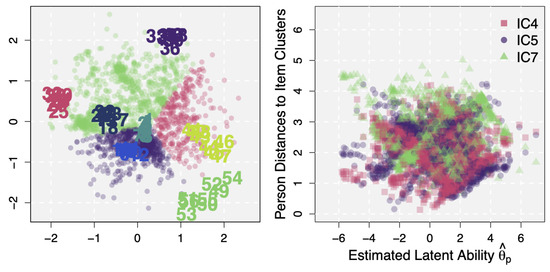 The left panel of Figure 3 shows the latent space of the IRDT dataset, estimated by the LSIRM. The model identified significant CD, with and . This CD is represented by distances on the latent space between persons, between items, and/or between persons and items. First of all, numbers in the latent space represent the estimated positions of test items (circles represent persons, but they will be studied in Section 3.2.4). They are color-coded according to the latent dimension assignments obtained by the previous EGA approach. Although the first three clusters (items 1–8, 9–16, and 17–24) were located relatively close to each other, items in the latent space generally show the same item clusters as found by EGA.