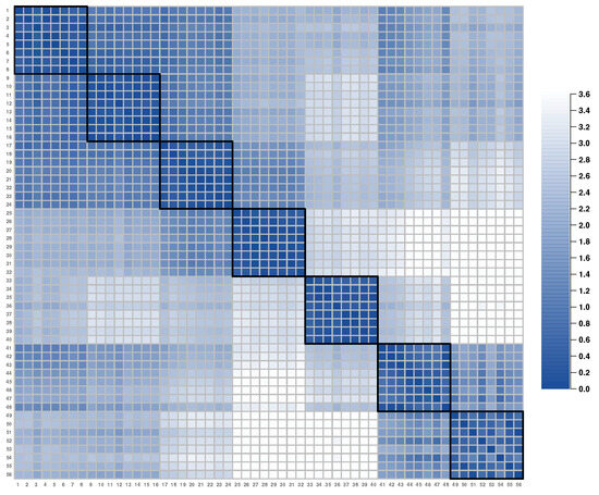 Additional support for the latent item clusters can be obtained by computing inter-item distances (for all i and j, ) on the latent spaces. This calculation produces an item distance matrix, which is visualized in Figure 4. In the figure, the distance values are color-coded according to the legend on the right side. Although there are some clusters closely located with each other, the figure shows a block-diagonal structure, which is consistent with the latent dimensions obtained in Golino and Epskamp (2017).