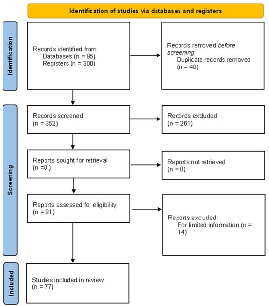 Overall, 95 records through database searching and 300 additional records through other strategies were identified. The content of each paper was examined to determine its inclusion in the analyses. To be included, the study had to provide an indicator of the sex differences in CR or other information that allowed us to estimate an effect size. Some primary studies on the relationship between CR and sex were excluded because (1) they did not empirically test the existence of differences in CR scores between men and women, or (2) the data reported were insufficient to estimate an effect size (e.g., Ibanez et al. 2013; Corgnet et al. 2015b). Likewise, we excluded those studies where the estimation of sex differences in the CRT was confusing or did not allow us to make a clear interpretation (e.g., Nieuwenstein and van Rijn 2012). We also excluded the studies that established a time limit to take the CRT (e.g., Ring et al. 2016), as this requirement might add an additional error to our findings and inflate the true variability. Therefore, the meta-analysis was conducted with a final database of 77 documents. The PRISMA flowchart (Page et al. 2021) of the literature review can be seen in Figure 1.