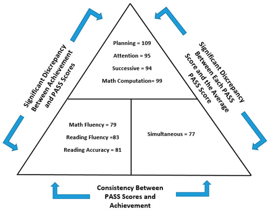 According to Naglieri (2000), (see also Naglieri and Otero 2023), one can use the DCM approach to identify children’s cognitive strengths and weaknesses and subsequently inform instruction. The DCM was originally proposed by Davis (1959) and then further developed by Kaufman (1979) and Silverstein (1993). It is an ipsative method that determines when children’s PASS scores are reliably different from their average PASS score and reliably different from their academic achievement scores. The DCM technique has three parts: two discrepancies and one consistency that jointly form a pattern of strengths and weaknesses (see Figure 1 for an illustration).1 A PASS scale discrepancy is found if there is a significant difference among the four PASS scales relative to the child’s overall performance in PASS (e.g., PASS composite score), with one or two PASS scores being substantially below what is considered typical (the normal range). A second discrepancy is found between the PASS strengths and academic weaknesses. The consistency portion of the DCM is found when achievement scores are consistent with the low PASS scores. Such a finding provides evidence that a child has a disorder in the basic psychological processes necessary for a SLD identification (Naglieri and Feifer 2018; Naglieri and Otero 2017).