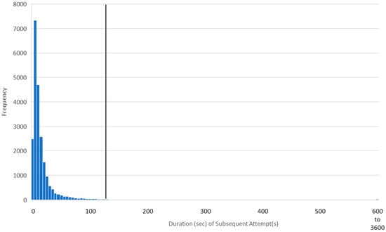 Distribution of durations of subsequent answer attempts for a single question. The mean + 2 SD interruption threshold (113.71 s) is identified by a vertical line. Interactions longer than 600 s were condensed for visual clarity.