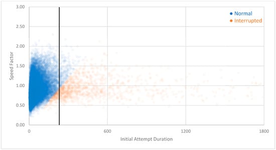 Figure 5 presents a scatterplot of learners’ initial-attempt durations versus their initial-attempt speed factors4 for the item shown in Figure 1. The speed-factor-agnostic threshold from Study 1 is included as a point of reference. As can be seen (and as was expected), some interactions previously categorized as normal became categorized as interrupted. A smaller number of interactions previously categorized as interrupted became normal.