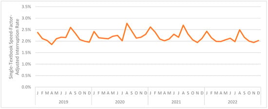 A test of equal proportions indicated that interruption rates in the four time periods were statistically significantly different: χ2(3, N = 152,778,376) = 2186.2, p ≈ 0. Comparing 2020 to 2019 yielded an effect size of h = 0.00904. Comparing 2020 to 2021 yielded an effect size of h = 0.00647. Comparing 2020 to 2022 yielded an effect size of h = 0.00900. In all cases, to quote (), “the true effect is close enough to zero for our practical purposes” (p. 355).