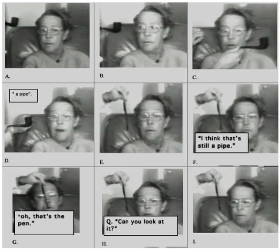 The patient shown in Figure 2 was being shown a comb and a pipe, one behind the other, by a doctor wearing a white coat. She reported seeing either the comb or the pipe, but not both. At one point, however, she reported seeing “a white coat” that the doctor was wearing. She then paused for several seconds and said, “I do not know why, I think there’s like a comb and a jacket that kind of thing”. When seeing a comb against the background of the doctor’s jacket, she could not make sense of it, and she reported seeing “a comb and a jacket, that kind of thing”, as if her perception was unable to accommodate seeing more than one object.