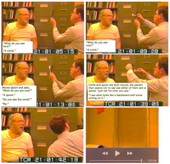 Figure 3 from this video (Video S2, “Balint Chalk for Figure 3”, provided in the Supplementary Materials) shows a series of images of another patient with bilateral parietal damage. It demonstrates the symptoms of simultaneous agnosia. His visual world contains only a single object. He cannot see a second object placed in front of or behind the first, even though it is projected onto the same region of the retinae. So, he reported either seeing a comb or a spoon, but he never saw both. At one point, his eyes focused on some chalk marks on a blackboard behind the examiner, and both objects he had just seen individually (the comb and the spoon) disappeared. Note, however, that he did not report seeing an isolated white line; he reported seeing a “blackboard with some writing on it”.