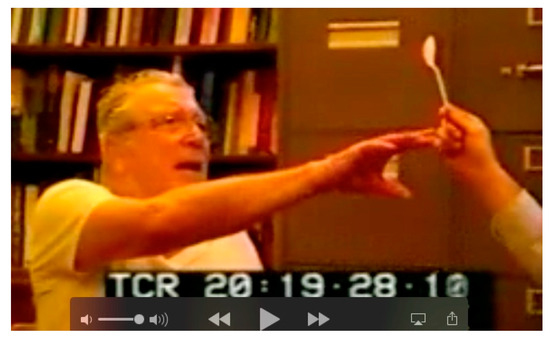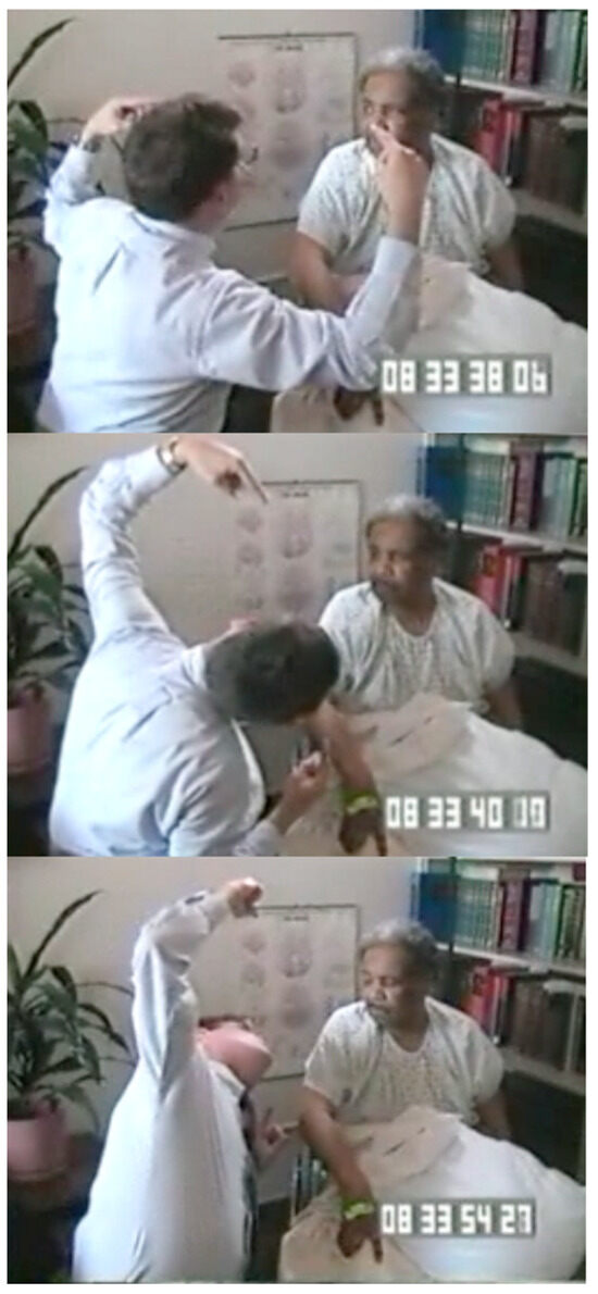 Figure 4. Optic ataxia (misreaching) in a patient with Bálint’s syndrome. Although this patient said that he saw a spoon and was looking at it straight in front of him, he was unable to accurately reach toward it or to orient his hand appropriately to grasp it. From a video by Perpetua Productions.