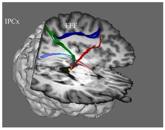 Figure 6. Virtual dissection, with probabalistic diffusion tractography, showing that the dorsal stream is embedded in a network with the superior colliculus, on the back of the midbrain (yellow), as its hub. The dorsal stream refers to projections (not shown) from the primary visual cortex (V1) to the dorsal extrastriate cortex including the intraparietal cortex (IPCx) and the frontal eye field (FEF). The colliculus receives visual signals from the retina both directly, via the retinotectal tract (pink), and from the primary visual cortex (light blue), with both visual pathways entering the colliculus via the brachium of the superior colliculus. In addition to receiving visual signals from the magnocellular and parvocellular layers of the lateral geniculate nucleus, the visual cortex also receives visual signals from the superficial layers of the superior colliculus via the koniocellular layers of the lateral geniculate nucleus (not shown). The intraparietal cortex also receives information about the position of the eyes in the orbit: When the superior colliculus sends eye movement commands to eye movement generators in the brain stem, a copy of the command is sent, via recurrent axon collaterals, to the intraparietal cortex via the frontal eye fields (red). The region of the frontal eye fields that receives eye movement signals from the colliculus projects to the intraparietal cortex as a component of the superior longitudinal fasciculus (dark blue); and the intraparietal cortex, in turn, is connected to the superior colliculus (green). The frontal eye field also sends endogenously generated commands for voluntary eye movements to the superior colliculus—which is the final common pathway for initiating orienting responses.