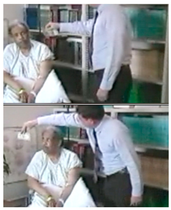Figure 2 shows a series of sequential images from a video [Video S1, “Balint eye movement for Figure 2”, provided in the Supplementary Materials] of a patient who had experienced recent bilateral parietal strokes and had begun to make a partial recovery. She could recognize an object held directly in front of her, but if it was moved, it would immediately disappear. She was spatially disoriented: when she was asked to rise from her chair and walk across the room, she could not find her way back to her chair.