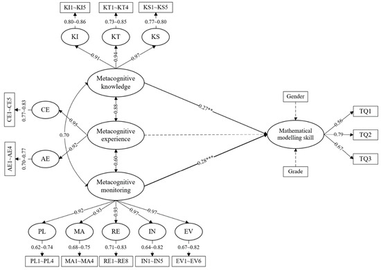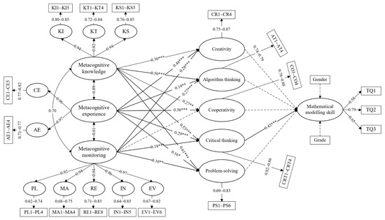 As shown in Table 2, there was a significant positive correlation between the three factors of metacognition (metacognitive knowledge, metacognitive experience, and metacognitive monitoring) and mathematical modeling skills (p < 0.001). The factors of creativity, algorithmic thinking, cooperativity, critical thinking, and problem-solving in computational thinking were positively correlated with mathematical modeling skills (p < 0.001). The three factors of mathematical metacognition were significantly positively correlated with the five factors of computational thinking (p < 0.001). The results of correlation test support the follow-up analysis of SEM.
