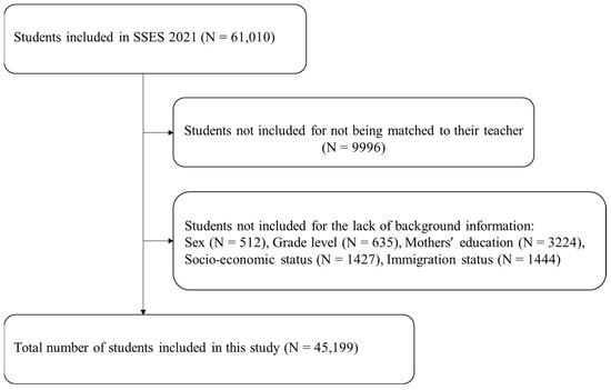 More specifically, inclusion criteria for study subject selection in this present study are defined as follows: (1) participated in the first wave of the SESS; (2) matched with the teacher or school students; (3) completed informed consent to participate. The resulting analytic sample involved 45,972 subjects who satisfied the inclusion criteria (Figure 2).