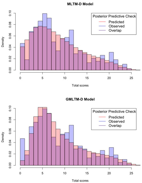Posterior predictive check histograms. These histograms compare predicted and observed distributions, enabling a visual assessment of model fit.