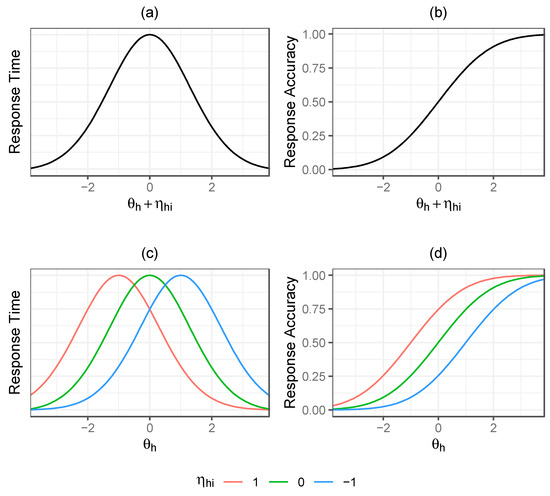 For response times in time-limited tests (or in non-time-limited tests where the time spent on the test may still be a valued resource), it can often be suspected that faster response times on an item reflect two very different causes—(1) a respondent who clearly knows how to answer/solve the item and can report the correct answer quickly and (2) a respondent who clearly does not know how to answer/solve the item and chooses to move past the item (perhaps making a somewhat quick, more likely incorrect, guess). Both of these instances can be understood in relation to , the latent proficiency of the respondent. The combination of these two conditions can lead to a type of inverse U or inverse V relationship between the respondent’s expected performance on the item (typically viewed as a function of their general latent proficiency and the item parameters, such as difficulty) and response time. Respondents taking the longest time are those for whom their expected performance on the item is in between the extremes of the two levels of expected performance, such as a respondent that has a 0.5 probability of correct response. Such respondents might be expected to be sufficiently engaged with the item to continue working on it, but not so certain of the correct response as to be able to provide the answer quickly. If we appreciate as functioning in interchangeable ways with general latent proficiency in regard to expected response accuracy, it can be appreciated from the above theory that and should also be interchangeable in their influence on the response time for item . For our two hypothetical respondents (the medium-proficiency respondent who knows the answer and the high-proficiency respondent who is uncertain), we expect a faster response time for the medium-proficiency respondent on this item (despite a general latent proficiency that would imply a slower response), but a slower response time from the high-proficiency respondent. Such a perspective appears consistent with the anticipated response times in the presence of explicit scoring rules that are sensitive to response accuracy and time (Maris and Van der Maas 2012). Moreover, even for tests without such explicit scoring rules, but for which the speed of response is implicitly rewarded (e.g., by the ability to devote more time to other items, by the ability to finish the test early) we might anticipate a similar functional form. Such conditions might be viewed as reflecting a combination of both spontaneous and imposed speed (see, e.g., De Boeck et al. 2017) within the same test. Related observations are also seen in measures of noncognitive traits using rating scale instruments, where the slowest responses are often seen for respondent–item interactions that lead to expected responses in the middle of the rating scale, and faster times are seen as the expectation is away from the middle (Ranger 2013; Ranger and Ortner 2011; Kim and Bolt 2023).