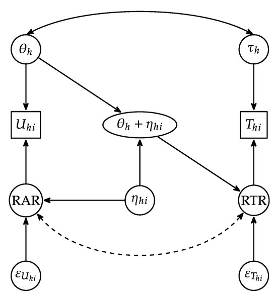 As mentioned earlier, our perspective on the RAR/RTR statistical dependencies in the joint response accuracy/response time model is an addition to the models presented in Figure 1 of Bolsinova et al. (2017a). A graphical depiction of our conceptual model for response time is shown in Figure 3. Similar to other joint accuracy and response time models, we include observations of response accuracy () and response time (), as well as the underlying respondent latent traits of general proficiency () and speed (). Also present are residuals associated with response time (RTR) and response accuracy (RAR), which we separate into two parts—a trait-like item-specific factor () that influences both the RAR and RTR and residual parts that are independent (). The RAR is defined as the combination of the components . Under our approach, we view the latent proficiency and item-specific factor as influencing the RTR and, more specifically, displaying a disordinal interaction in their predictive effects. Such an interaction is consistent with the representation in the right panels of Figure 2. Although Figure 3 makes it clear that need not strictly be viewed as a part of the RAR, we choose to interpret it that way, as such factors have historically been viewed as present in psychometrics (e.g., the common factor model).