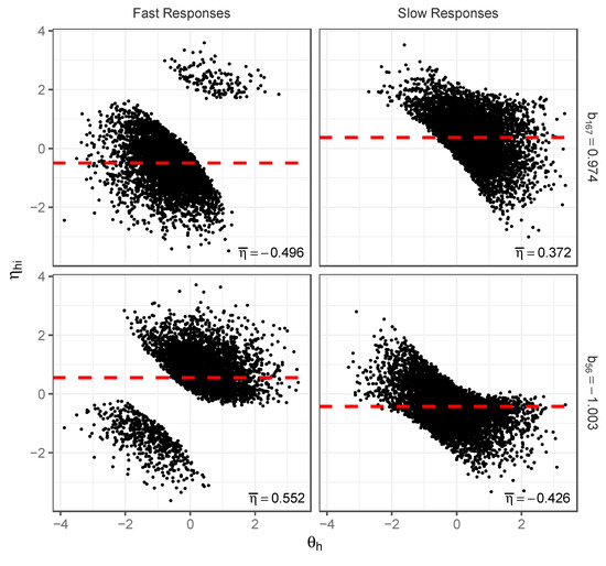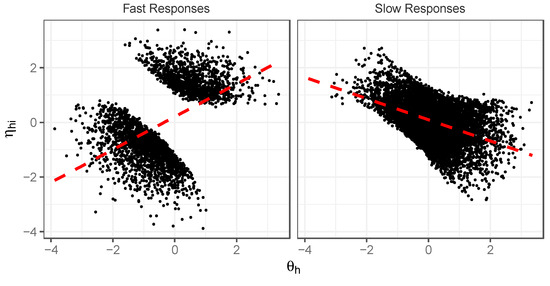 Since this is a simulation, we can evaluate why these patterns of effects emerge by examining the conditional distributions of and seen in the fast and slow classes. Figure 5 displays a scatterplot of the generated and parameters for the fast and slow response classes, respectively, for a medium-difficulty item ( approx. ). Note that for responses to this item that are slow, we have a bivariate distribution for that has a strong negative correlation (as reflected by the red line)—respondents that have high have lower , and those with lower have higher . For fast responses, the opposite occurs: respondents with high have high , and those with low have low . As a result, we see a positive correlation between and (as reflected by the corresponding red line) in the fast class. Recalling that our IRT analysis producing these heterogeneous discrimination estimates is only attending to the effects of , it then becomes clear why the estimated item discrimination is low in the slow class but high in the fast class. The effects of are ultimately being exaggerated in the fast class (as effects related to are being attributed to ) but are understated in the slow response class (effects related to are working in the opposite direction to the effects of ).
